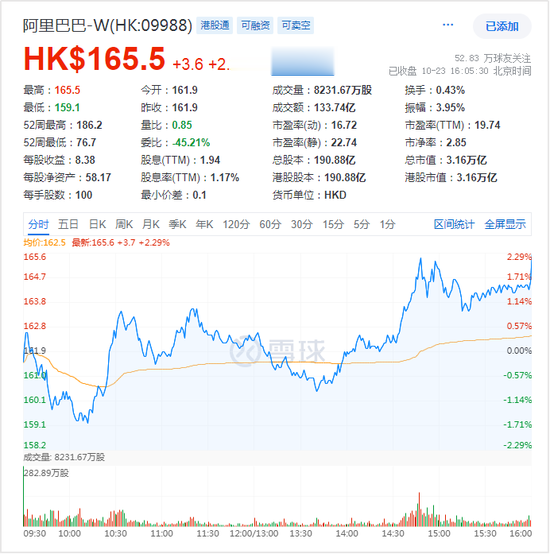 或受利好消息影响。截至10月23日,阿里巴巴港股报收165.5港元/股,涨2.22%,市值3.16万亿港元。