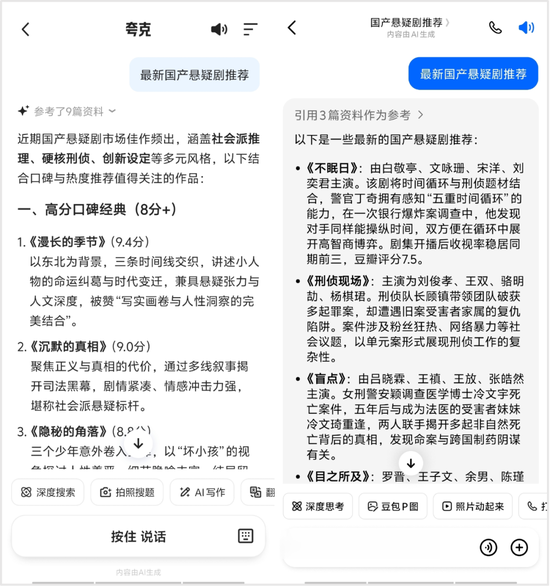 在“最新国产悬疑剧推荐”的问答中,夸克助手按照高分口碑经典、2025年新作、创新题材与社会议题、待播与潜力爆款分类推荐了12部,而豆包仅盘点推荐了6部。