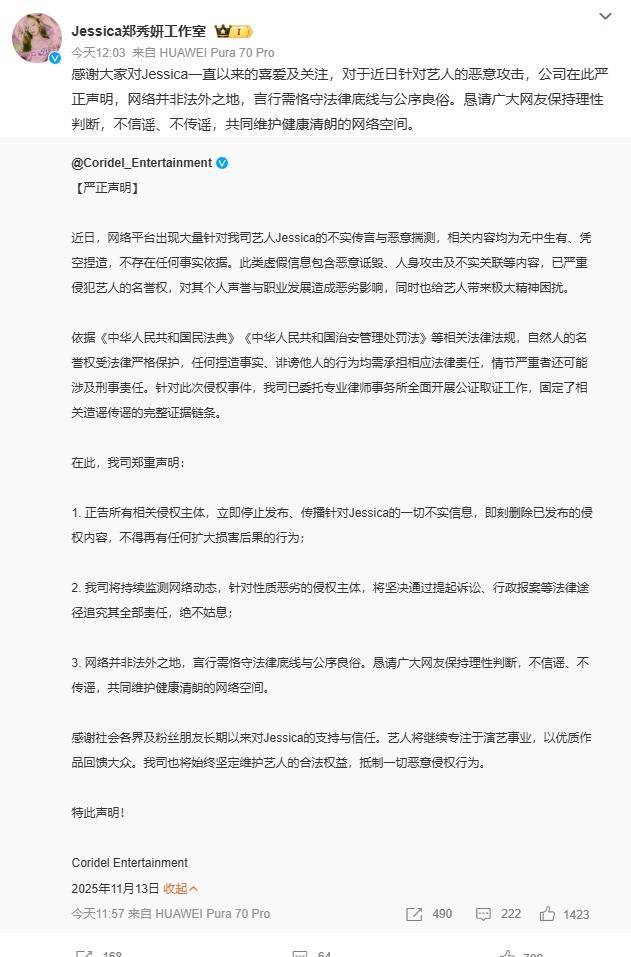 13日中午郑秀妍工作室发文回应:感谢大家对Jessica一直以来的喜爱及关注,对于近日针对艺人的恶意攻击,公司在此严正声明,网络并非法外之地,言行需恪守法律底线与公序良俗。恳请广大网友保持理性判断,不信谣、不传谣,共同维护健康清朗的网络空间。